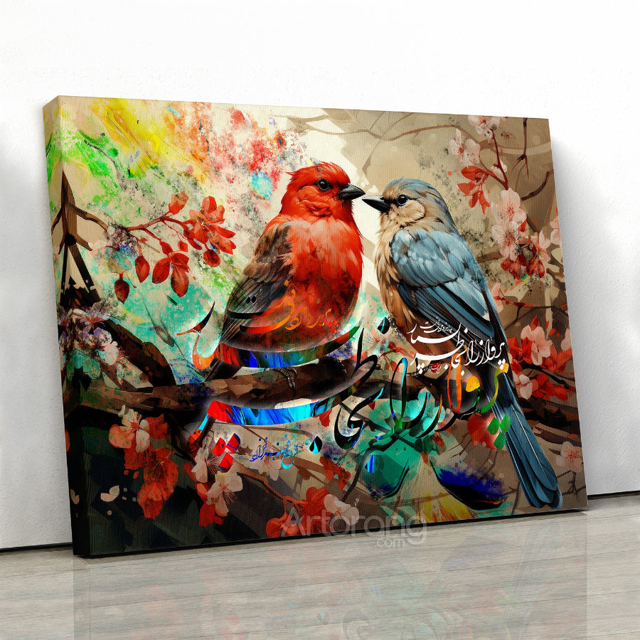 Discover the exquisite beauty of Persian art with this stunning canvas wall art, exclusively from Artorang. Featuring a vibrant color palette of reds, blues, and earthy tones, it beautifully captures the essence of Forugh Farrokhzad's poignant poem. The words remind us of the eternal spirit of flight, even in the face of mortality. Handwritten Persian calligraphy, seamlessly integrated into the design, adds an authentic touch. This masterpiece is available in multiple sizes, perfect for any space.