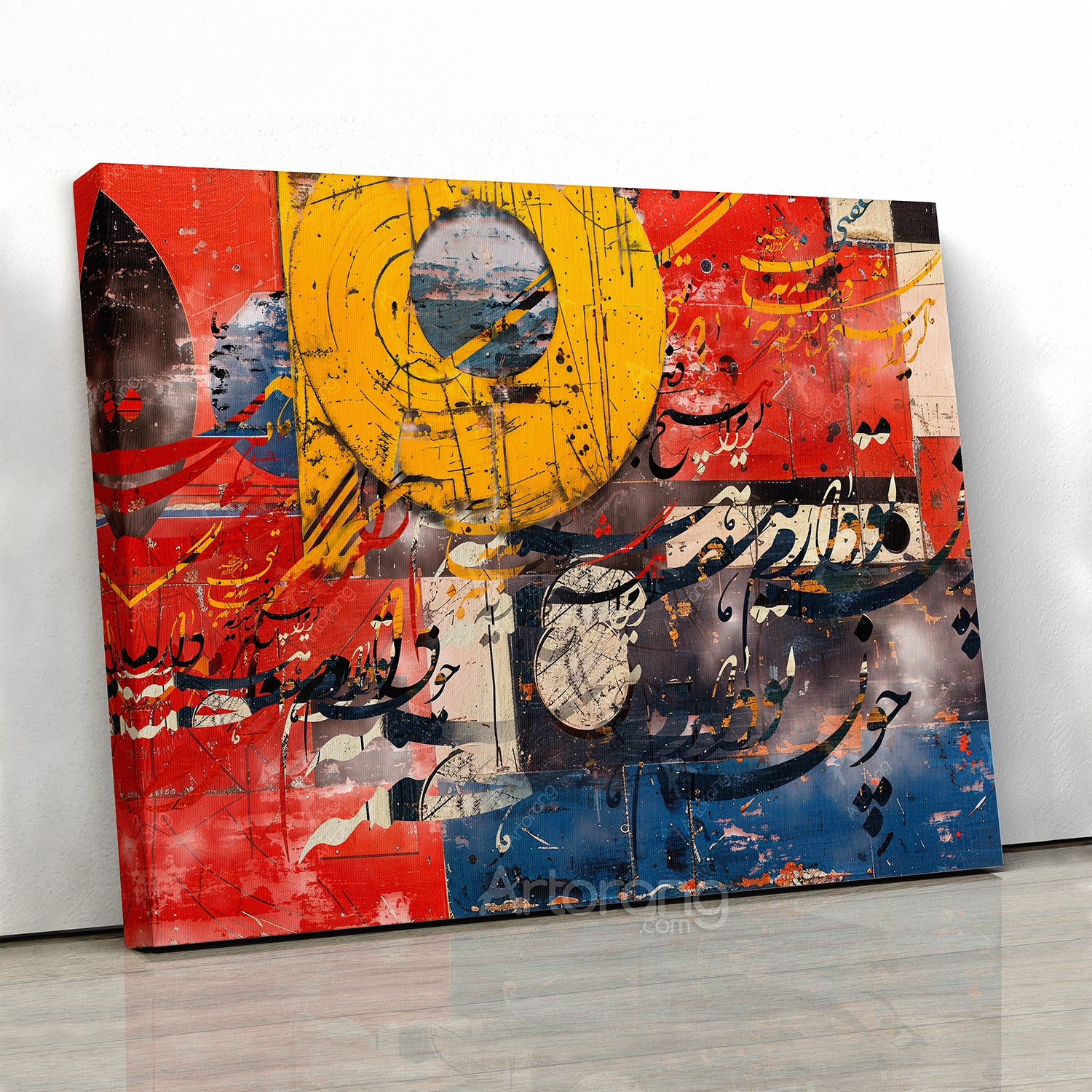 Bold abstract textures blend with flowing Persian calligraphy across the canvas.