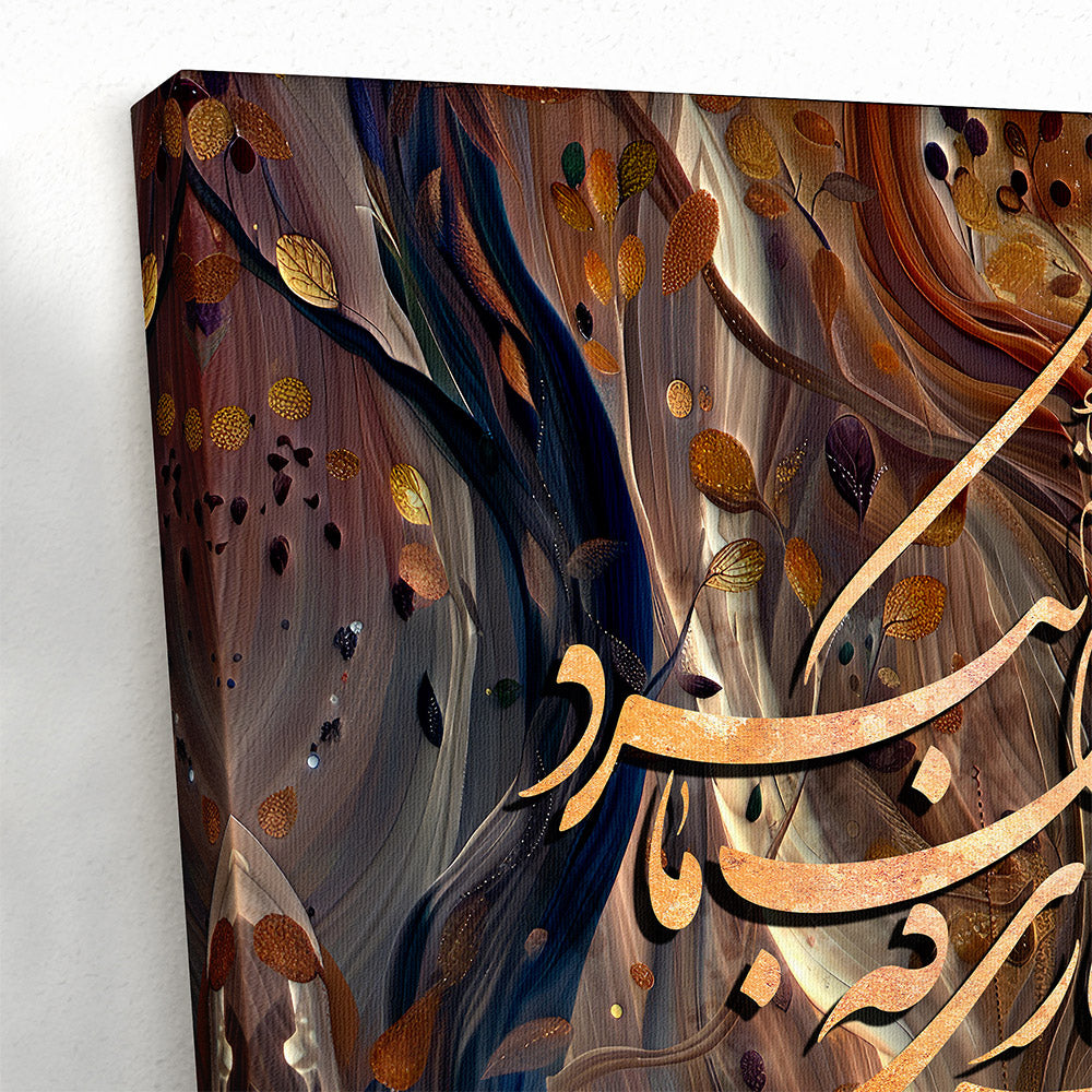 This artwork includes Persian calligraphy, written by hand on paper and then digitally incorporated into the final design for an authentic traditional touch. The overall style merges classic Persian aesthetics with contemporary digital art, making it suitable for modern interiors.