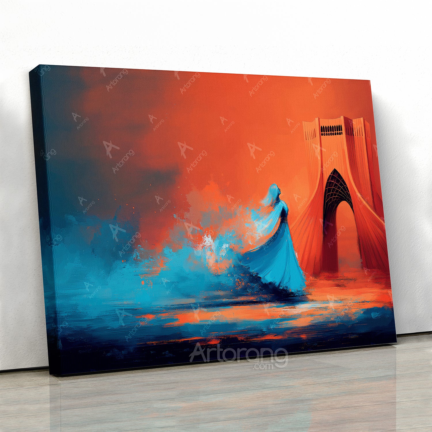 This stunning triptych artwork features the iconic Azadi Tower of Tehran, beautifully juxtaposed with a graceful Persian girl in flowing attire. The vibrant color palette of deep blues and fiery oranges creates a striking visual impact, evoking a sense of cultural pride and beauty. The artwork captures the essence of modern Persian art, blending traditional elements with contemporary style. Each panel is printed on canvas, gallery wrapped, and ready to hang, making it a perfect addition to any living space. Available in multiple sizes, this piece is sure to be a conversation starter in your home.