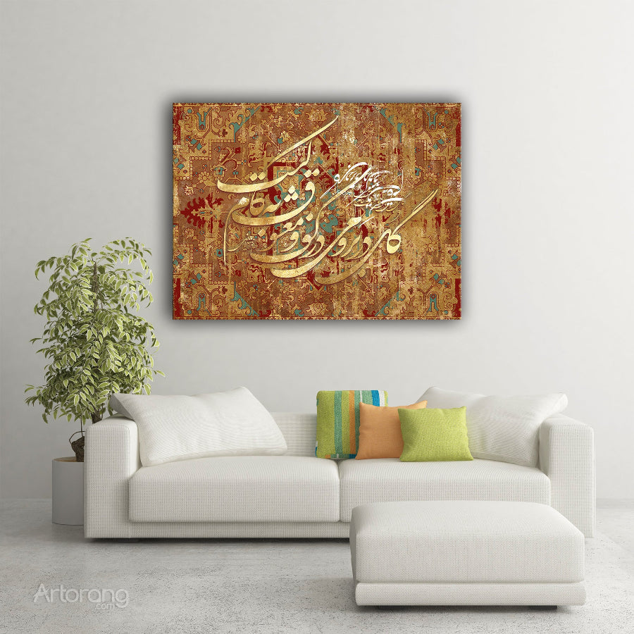 This stunning canvas wall art from Artorang features an exquisite Persian design, capturing the elegance of traditional motifs. The artwork is enriched with a serene poem by the celebrated poet Hafez, evoking themes of love and joy. A warm color palette of rich golds and earthy reds creates a captivating visual experience. The Persian calligraphy, elegantly handwritten on paper and digitally integrated, adds a refined touch. This exclusive Artorang design is a canvas print available in multiple sizes, perfect for adding a touch of Persian culture to any space.
