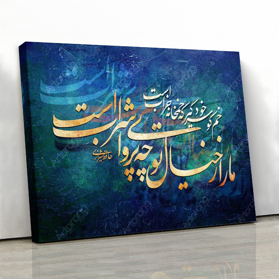 This exquisite canvas wall art by Artorang features a mesmerizing Persian design, showcasing the timeless words of Hafez. The poem evokes a deep sense of love and longing, beautifully captured in elegant Persian calligraphy, handwritten on paper and digitally integrated. The rich blue and gold color palette adds a touch of luxury and sophistication to any space. This exclusive Artorang design is a stunning addition to your decor, available as a canvas print in multiple sizes to suit your needs.
