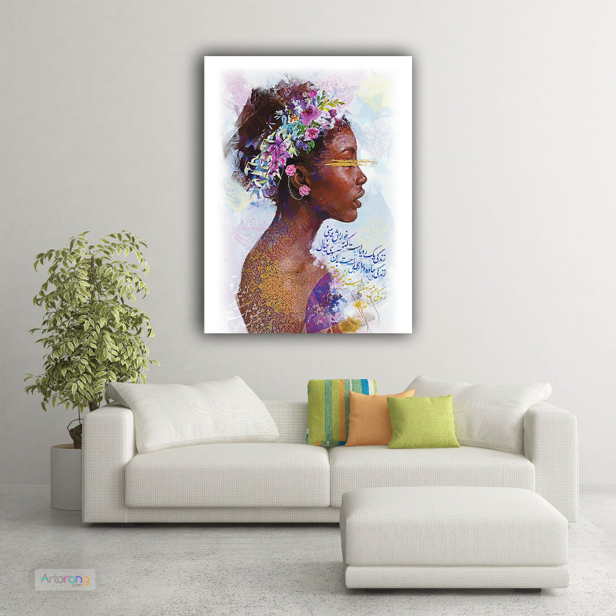 This exclusive Artorang canvas print beautifully blends vibrant colors and intricate Persian designs, creating a captivating visual experience. The artwork features a touching poem by Sohrab Sepehri, evoking dreams and journeys. The piece is enriched with Persian calligraphy, handwritten on paper and digitally integrated, adding authenticity and elegance. The thoughtful color palette of purples, pinks, and gold complements the emotional depth of the poem. Available in multiple sizes, this piece is perfect for adding a touch of sophistication to any space.
