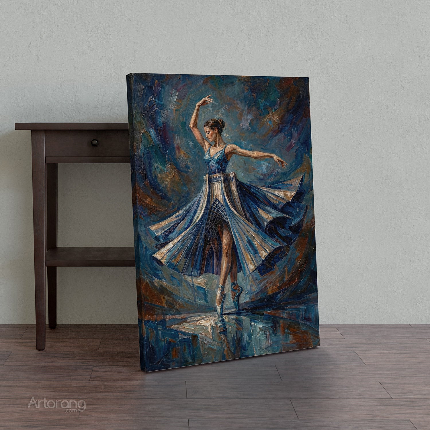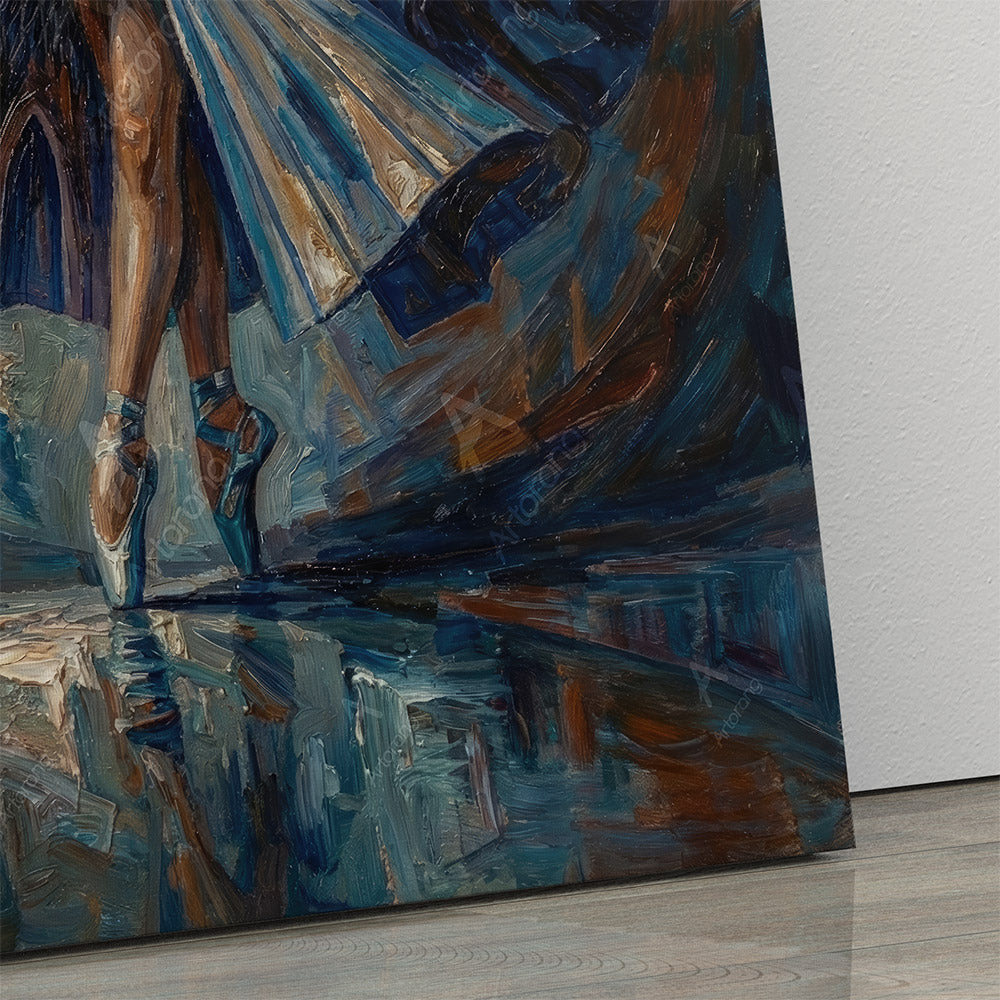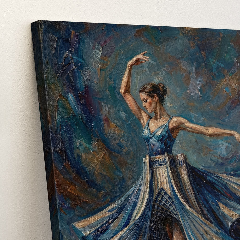 This captivating artwork features a Persian girl gracefully dancing, her skirt intricately designed to resemble the iconic Tehran Azadi Tower. The piece showcases a blend of vibrant blues and earthy tones, creating a dynamic and lively atmosphere. The dancer's elegant pose and flowing dress evoke a sense of movement and cultural pride. Printed on canvas, this gallery-wrapped art is ready to hang and will enhance any space. Available in multiple sizes, it's perfect for adding a unique touch to your home or office decor.