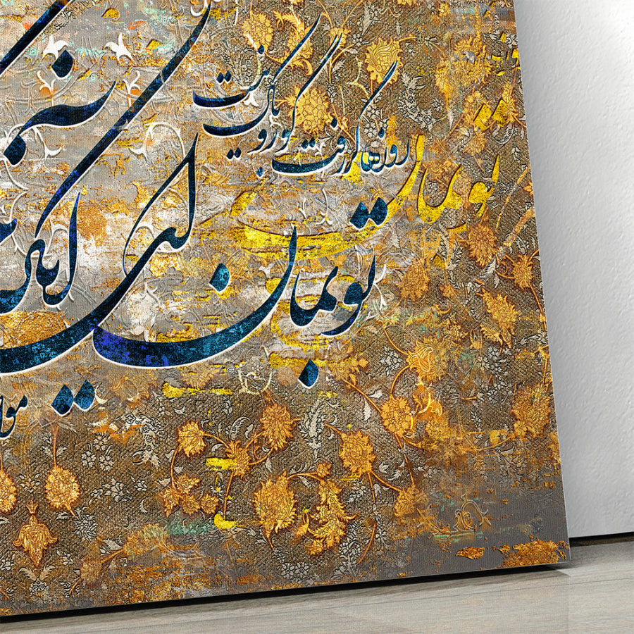 This exclusive Artorang canvas print beautifully captures the essence of Rumi's profound poetry. Featuring elegant Persian calligraphy, it reflects themes of purity and timelessness. The vibrant gold and turquoise hues add a touch of luxury, while the intricate handwritten calligraphy, digitally integrated, enhances its artistic allure. An ideal piece for Persian art enthusiasts, it brings a sense of serenity and sophistication to any space. Available in multiple sizes, this canvas art is perfect for home decor or as a thoughtful Persian gift.