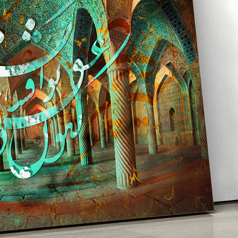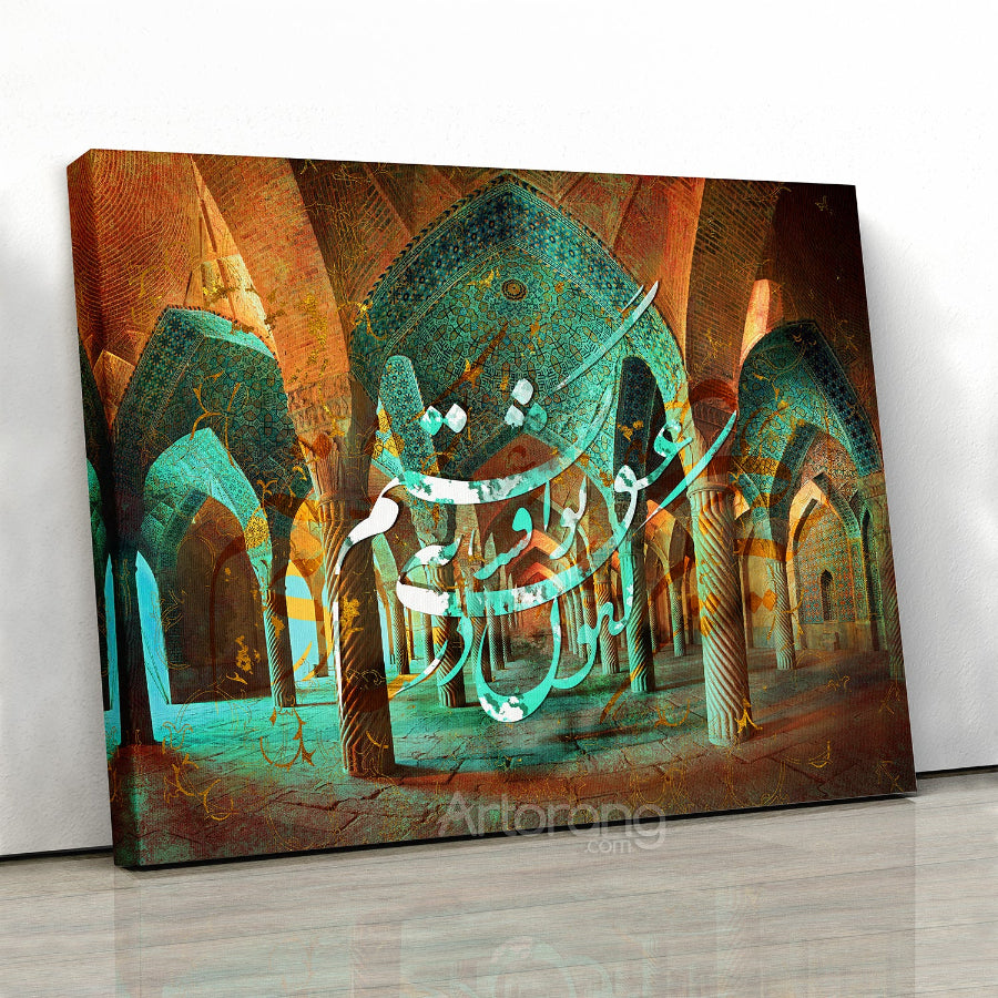 This exquisite canvas wall art from Artorang features a mesmerizing Persian design, capturing the romance and mystique of ancient architecture. The poem, "Now, in your love, I have become a legend," evokes deep emotions and timeless love. The artwork's rich color palette of turquoise and earthy tones is complemented by intricate arches. Handwritten Persian calligraphy, seamlessly integrated into the design, adds authenticity and elegance. This exclusive Artorang piece is available in multiple sizes, perfect for enriching any space with cultural depth and beauty.