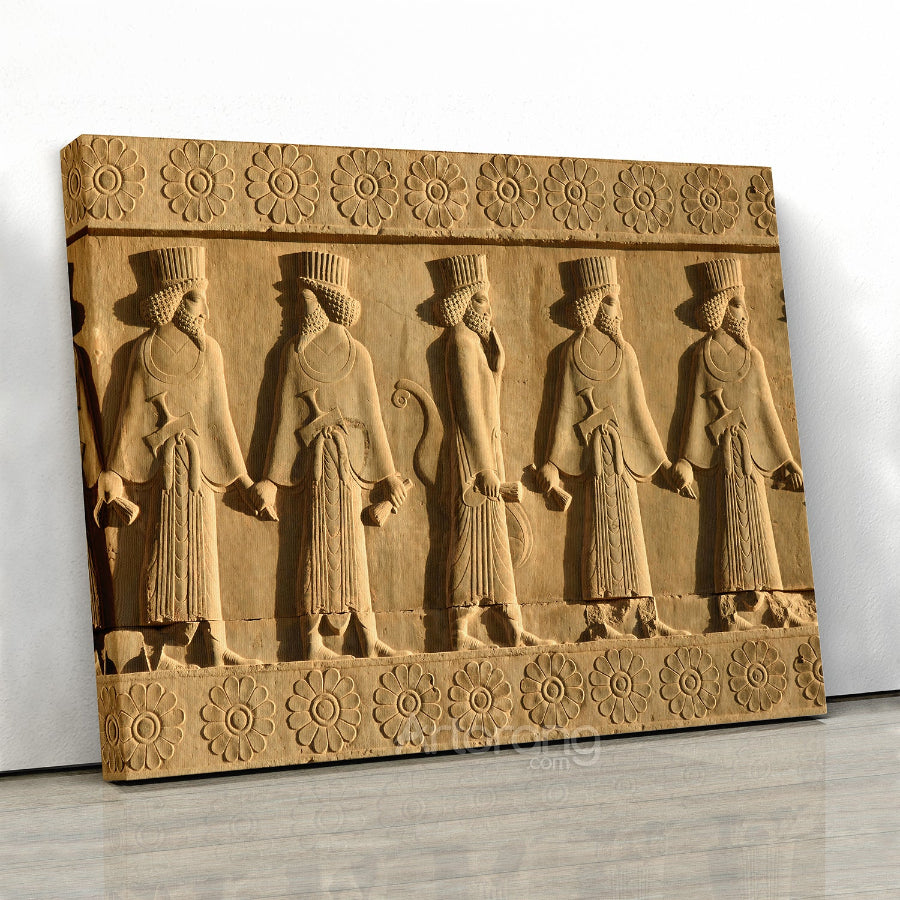 Transform your space with this exclusive Artorang canvas wall art, showcasing the intricate Relief at Apadana Palace. The artwork captures the essence of Persepolis architecture, featuring detailed carvings of ancient figures in a serene and majestic mood. The earthy beige tones reflect the historical ambiance, with floral patterns adding a touch of elegance. This multi-panel canvas print, available in various sizes, brings the grandeur of Takht-e Jamshid into your home. A masterpiece of Persian art, perfect for history enthusiasts and art lovers alike.